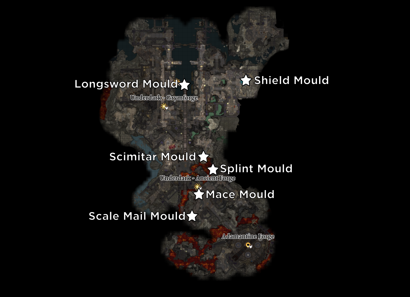 There are six molds around Grymforge that create: Longsword, Scimitar, Shield, Splint Armor, Scale Mail, and Mace. These molds are permanent—grab one and you can use it repeatedly. In my experience, party level 5–6 handles the area best (this doesn’t always work if you play very stealthy or pacifist).