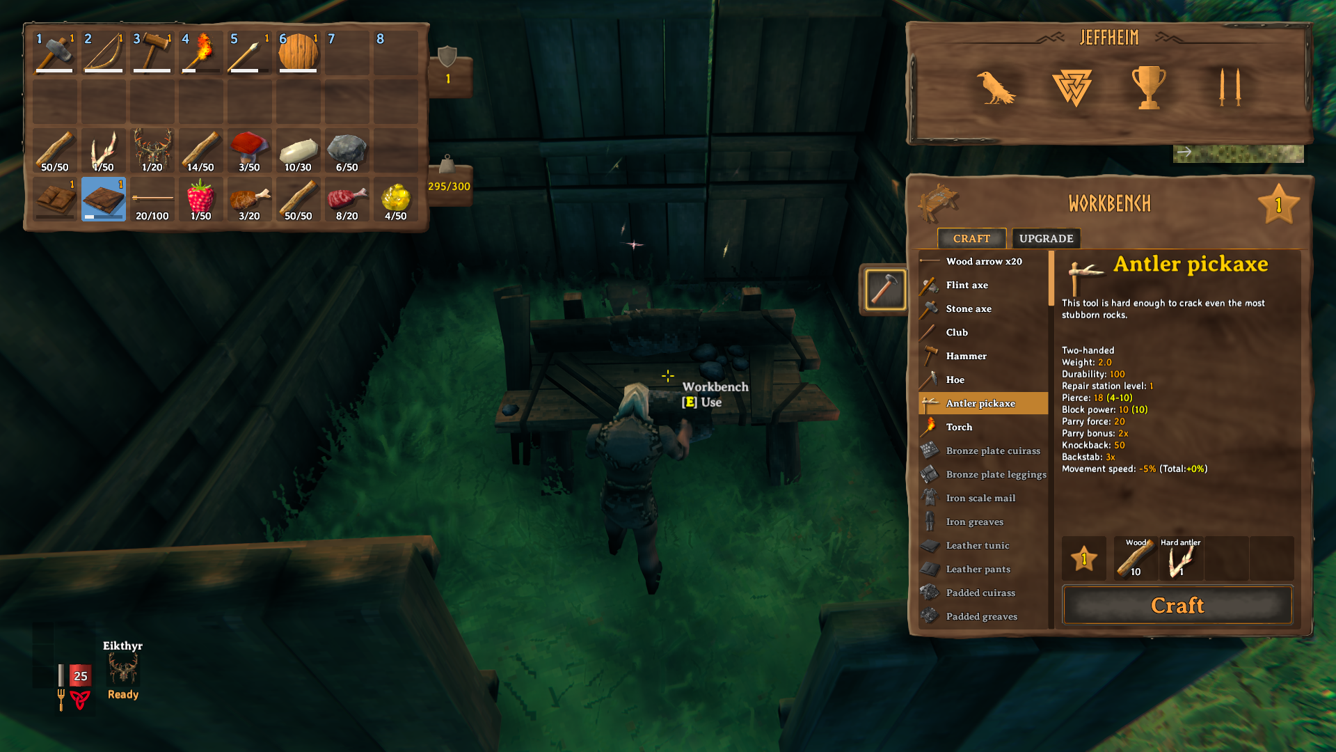 Which pickaxe first? Craft the Antler Pickaxe after killing Eikthyr; it gets you copper and tin and opens bronze. I’ve noticed many players treat early pickaxes like disposable tools — that’s a mistake. Plan ahead or you’ll backtrack later (and that sucks).